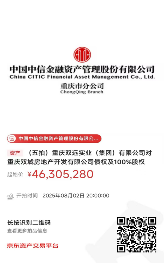 重慶雙遠(yuǎn)實(shí)業(yè)(集團(tuán))有限公司持有重慶雙城房地產(chǎn)開(kāi)發(fā)有限公司債權(quán)和100%股權(quán)。重慶雙遠(yuǎn)實(shí)業(yè)(集團(tuán))有限公司將于2025年8月2日20時(shí)至2025年8月3日20時(shí)在京東拍賣(mài)網(wǎng)通過(guò)公開(kāi)競(jìng)價(jià)方式進(jìn)行處置,拍賣(mài)鏈接如下圖所示,現(xiàn)予以公告。